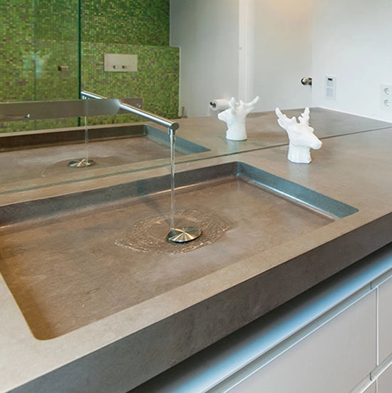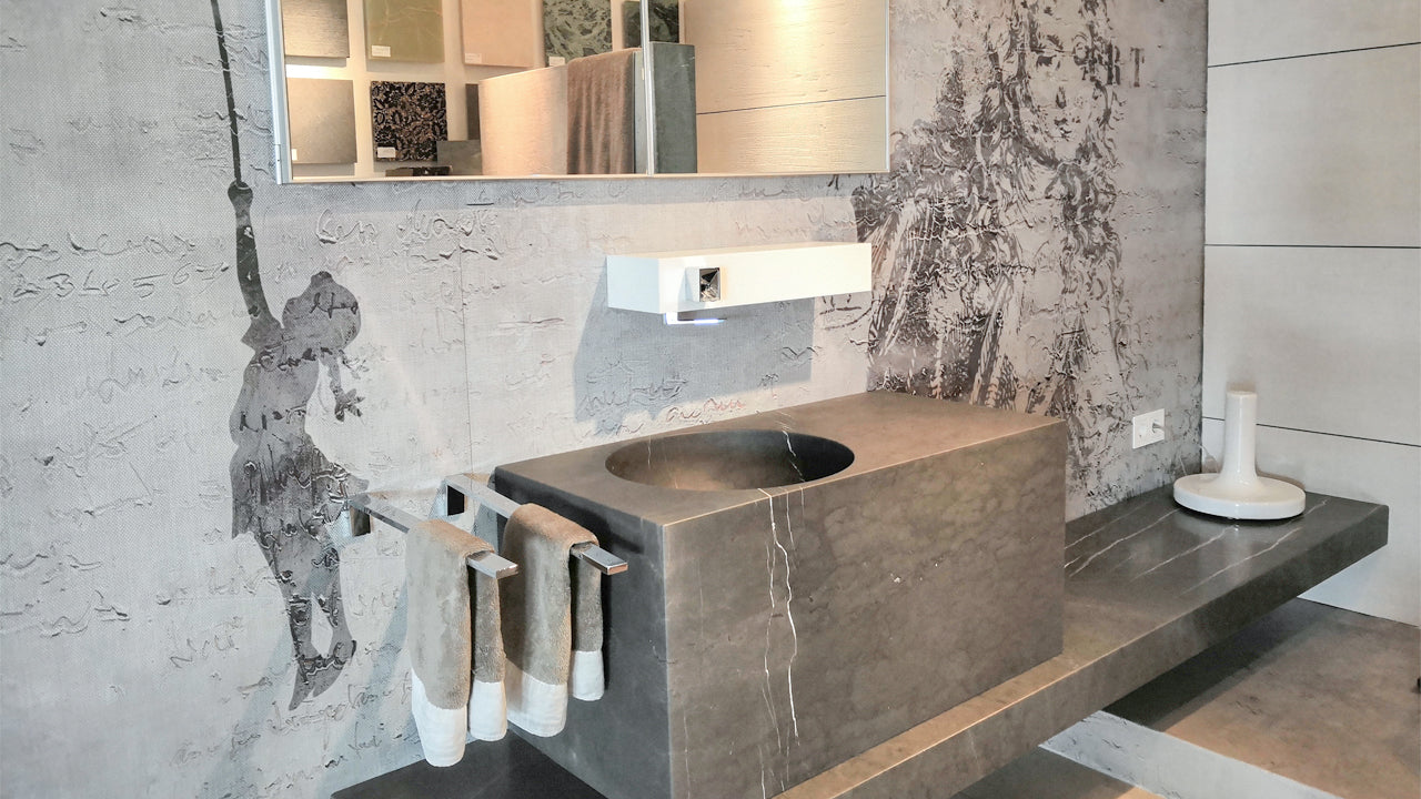 Der Waschtisch wird aus einem schweren Natursteinblock gefräst und per Hand geschliffen. Unsere Waschtische werden nicht geklebt.