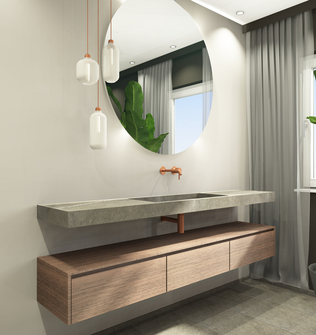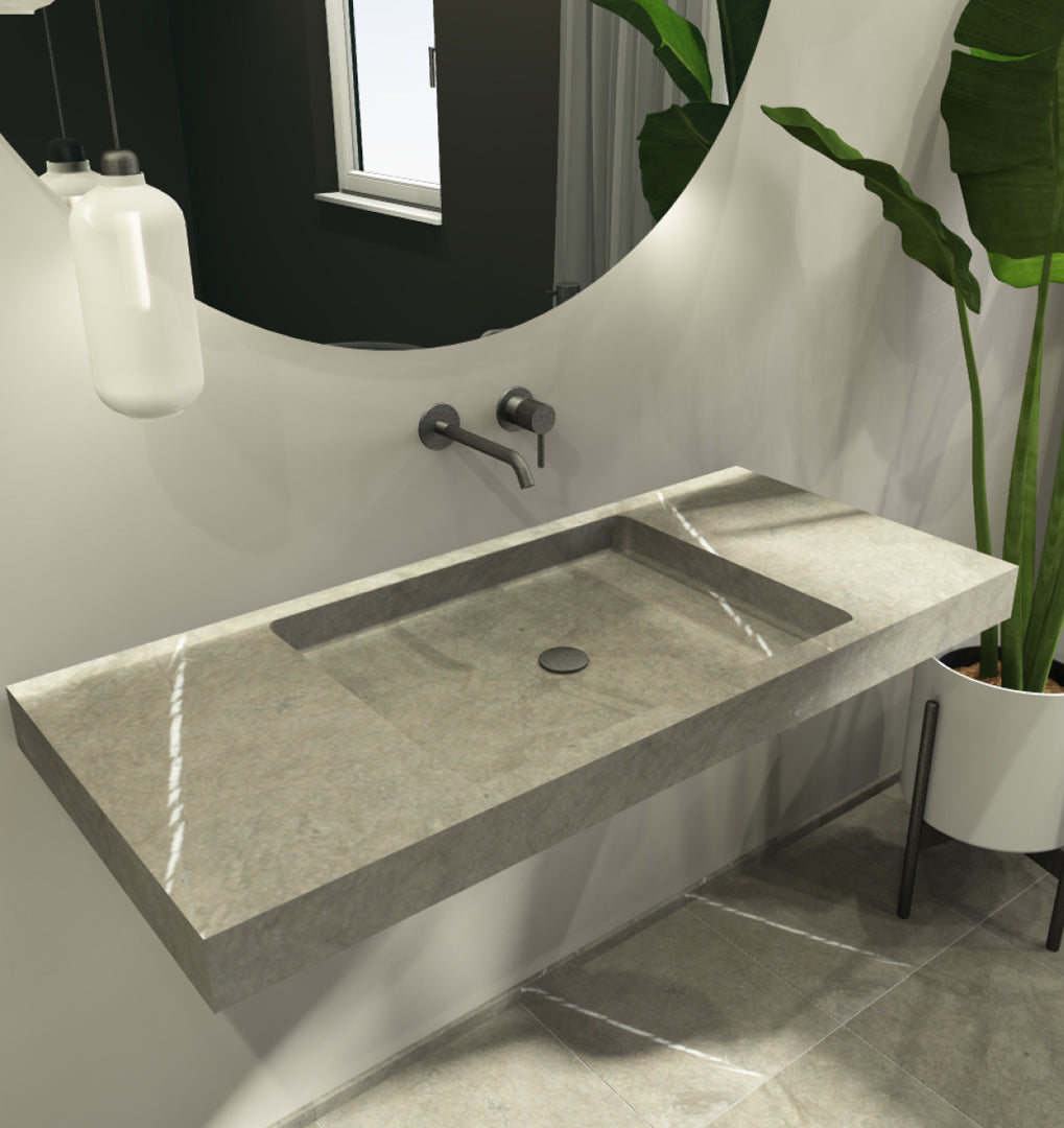 Naturstein Grigio di Tunisi. Limestone (Sandstein/Kalkstein). Farbe: Grau, eventuell mit weißen Adern. Waschtisch mittig.