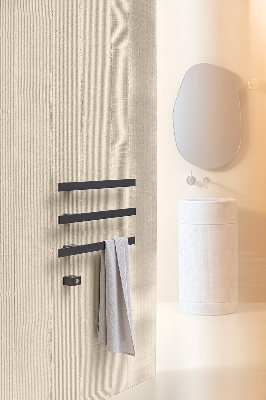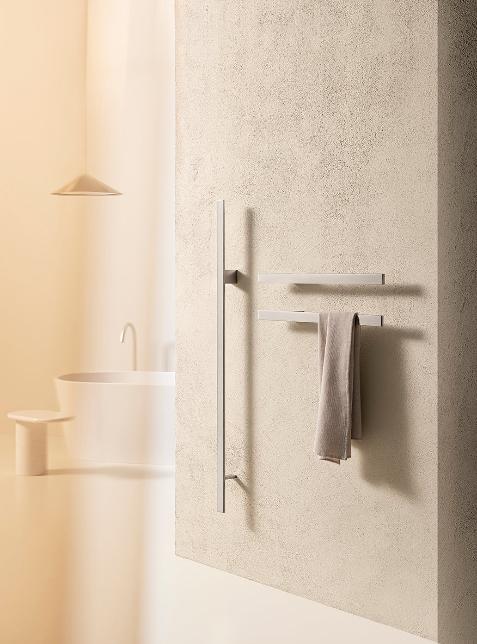Als Ergebnis einer komplexen technologischen Forschung und einer hartnäckigen Aufmerksamkeit für Details weist dieses elegante Heizmodul keine sichtbaren Nähte auf. Es ist ideal, um wie ein Bild die Wand in einem Wohnbereich zu schmücken, jedoch ist es auch für das Bad besonders geeignet: Die aufgehängten, gefalteten oder zusammengerollten Handtücher finden ganz praktisch sowohl bei der vertikalen als auch horizontalen Ausführung ihren Platz.