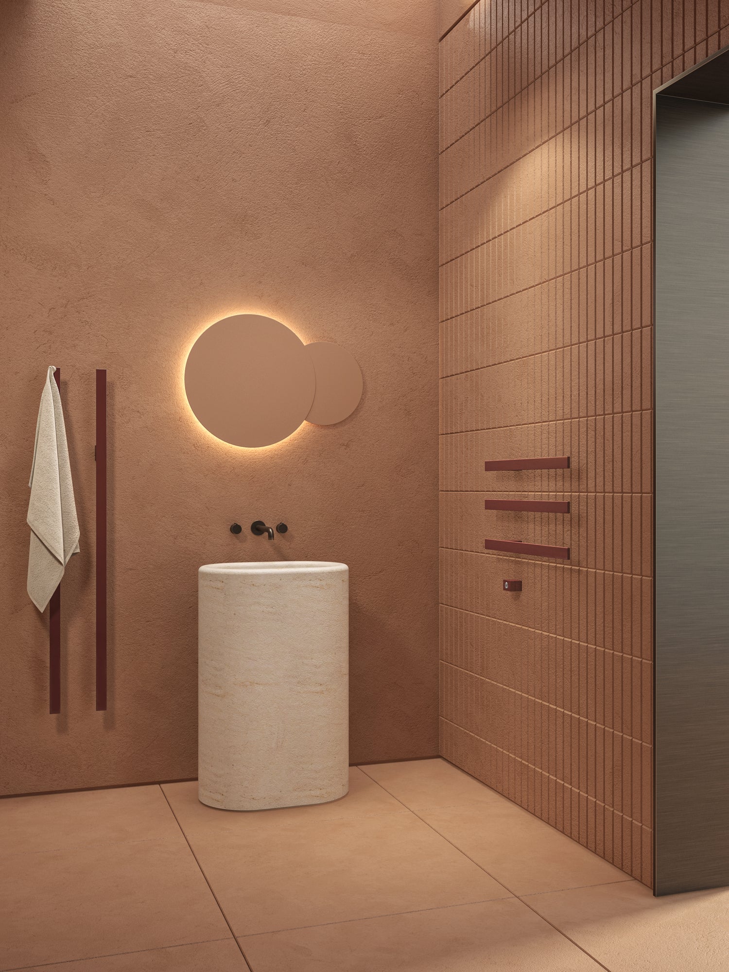 I Ching lässt dank der zahlreichen verfügbaren Abmessungen und den vielen bunten und galvanisierten Oberflächen, mit denen er mit den anderen Badelementen kombiniert werden kann, vielfache Lösungen an Zusammenstellungen zu.